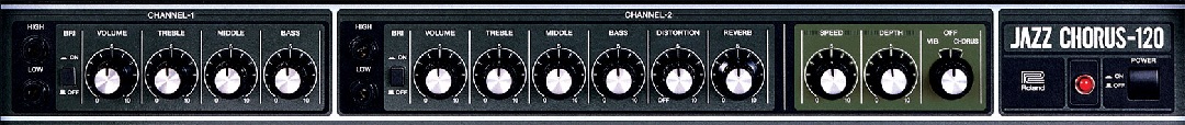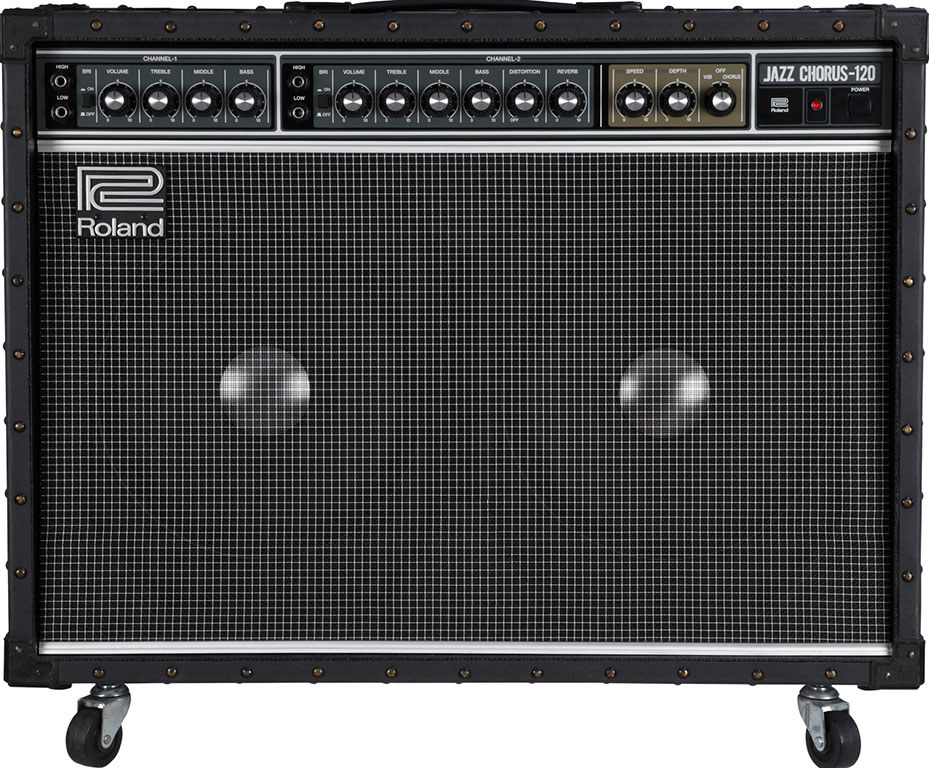 El JC120 de 120 pulgadas proviene del diseño de amplificador de potencia dual del amplificador: dos amplificadores de potencia separados entregan 60 vatios a cada altavoz de 12 pulgadas. Este diseño es la clave del legendario sonido de coro del JC-120, ya que un altavoz produce un tono normal y el otro produce un tono modulado, lo que da como resultado el enorme sonido Dimensional Space Chorus de Roland.